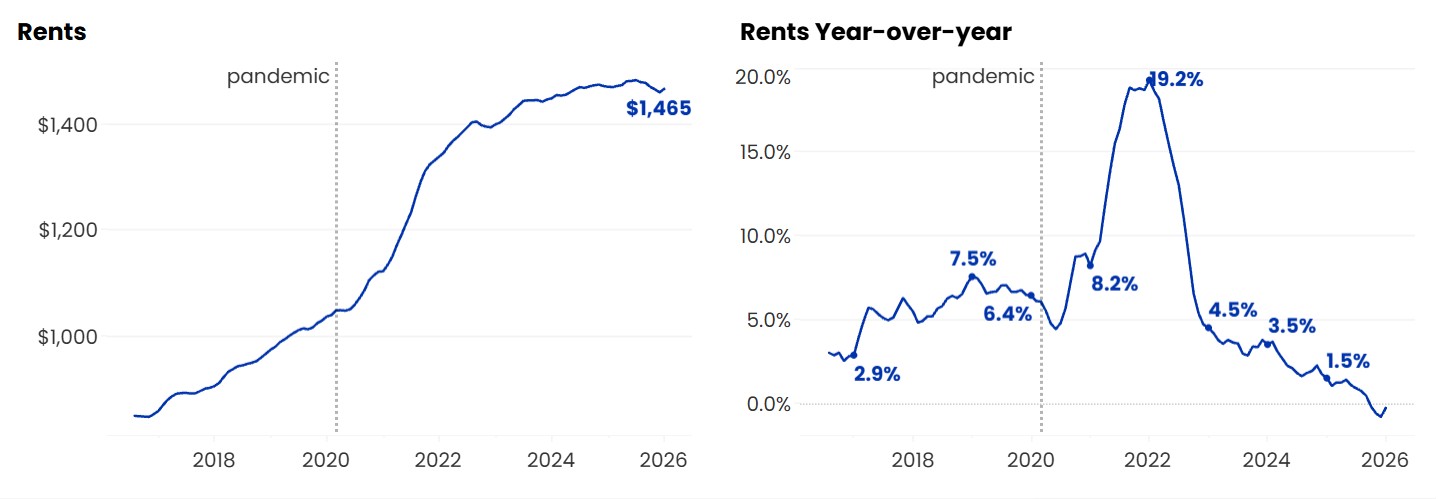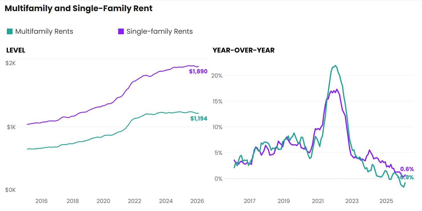 “Zillow forecasts single-family rents to rise 1.8% in 2026, while multifamily rents remain relatively flat (0.6%) as elevated vacancies and new supply continue to weigh on prices.”
